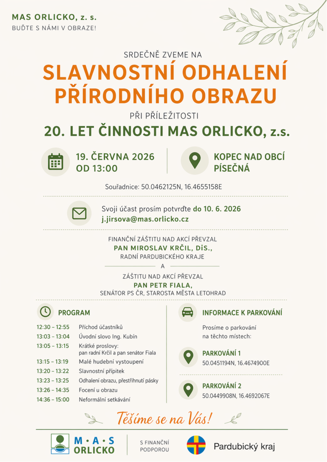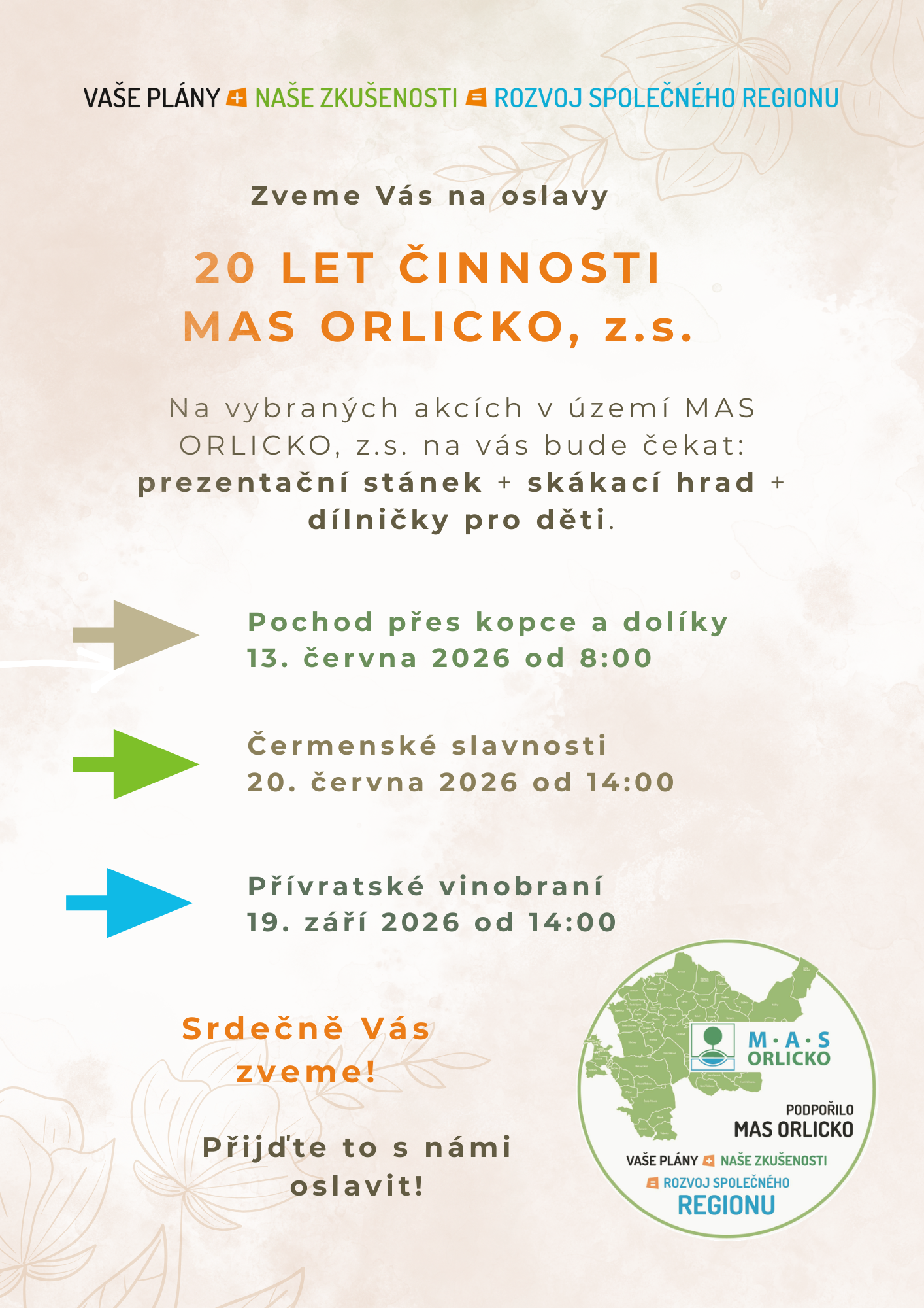 Na akcích bude náš tým prezentovat naši činnost, rádi si s vámi popovídáme o tom, jak podporujeme region a co je smyslem naší práce. Jaké možné dotace můžete od nás získat a jak přispíváme k rozvoji území MAS ORLICKO, z.s. Poznáte nás podle stánku s naším logem.