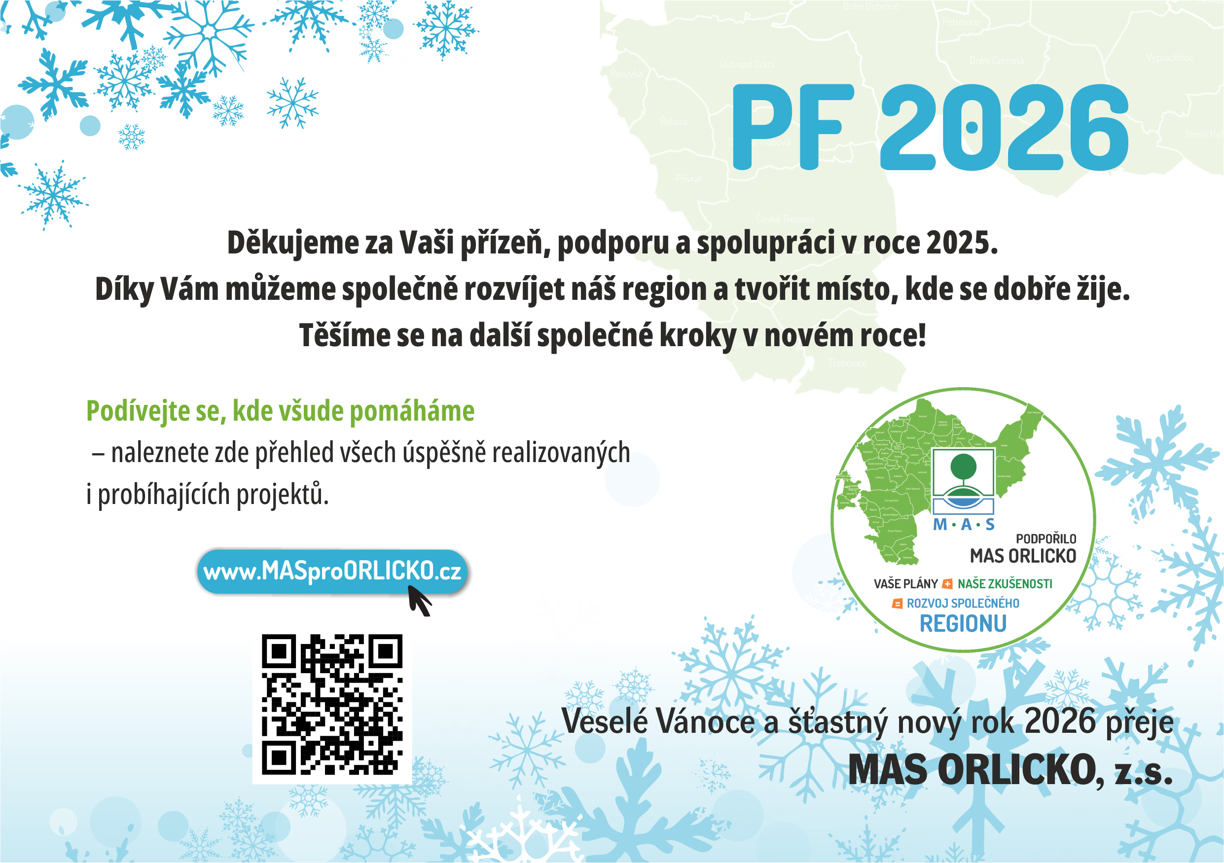 Ve dnech 19. 12. 2025 - 4. 1. 2026 bude kancelář MAS ORLICKO, z.s. uzavřena z důvodu čerpání dovolené. Děkujeme za pochopení a těšíme se na vás v novém roce!