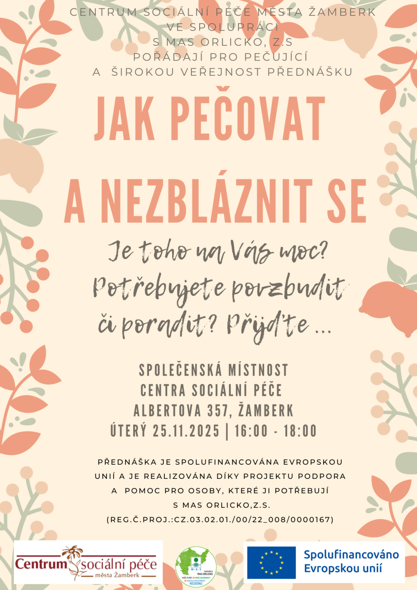 Zveme Vás na setkání s názvem: Jak pečovat a nezbláznit se. Bude se konat 25.11.2025 od 16:00 v Centru sociální péče v Žamberku. Pokud pečujete o nemocného člena rodiny a cítíte, že je toho na Vás už moc, přijďte si poslechnout zajímavé informace, rady a povzbuzení. Těšíme se na setkání s Vámi.