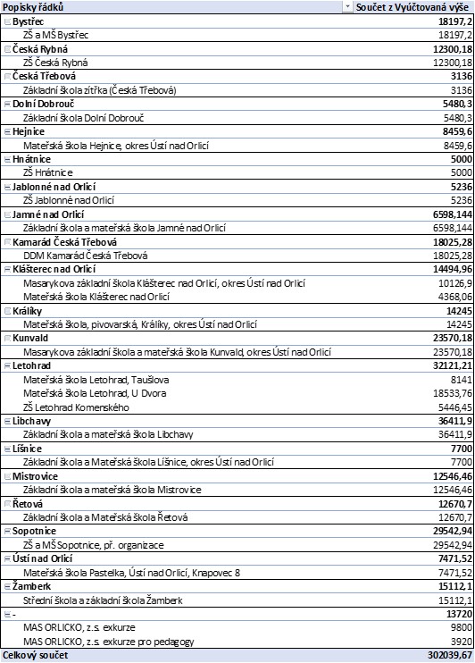Příklad: Za celkovou dopravu do vzdělávacích center SFÉRA Pardubice a Planeta Hlinsko zřejmě zaplatíte cca 15 000 Kč. Je tedy vhodné požádat o příspěvek 10 500 Kč na autobusovou dopravu (70 % z 15 000). Ten můžete, ale nemusíte, využít na dopravu na několik programů. MAS ORLICKO, z.s. Vám pak po uskutečnění všech výjezdů a po zaslání vyúčtování (faktury, doklady o zaplacení, čestné prohlášení) vyplatí příspěvek max. 70 % Vaší celkové ceny za dopravu, tedy 10 500 Kč, pokud Vás doprava opravdu bude stát přesně 15 000 Kč.